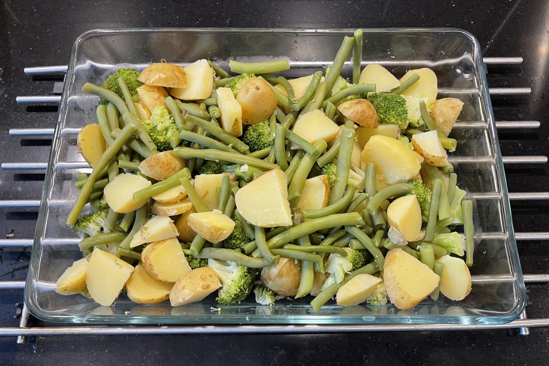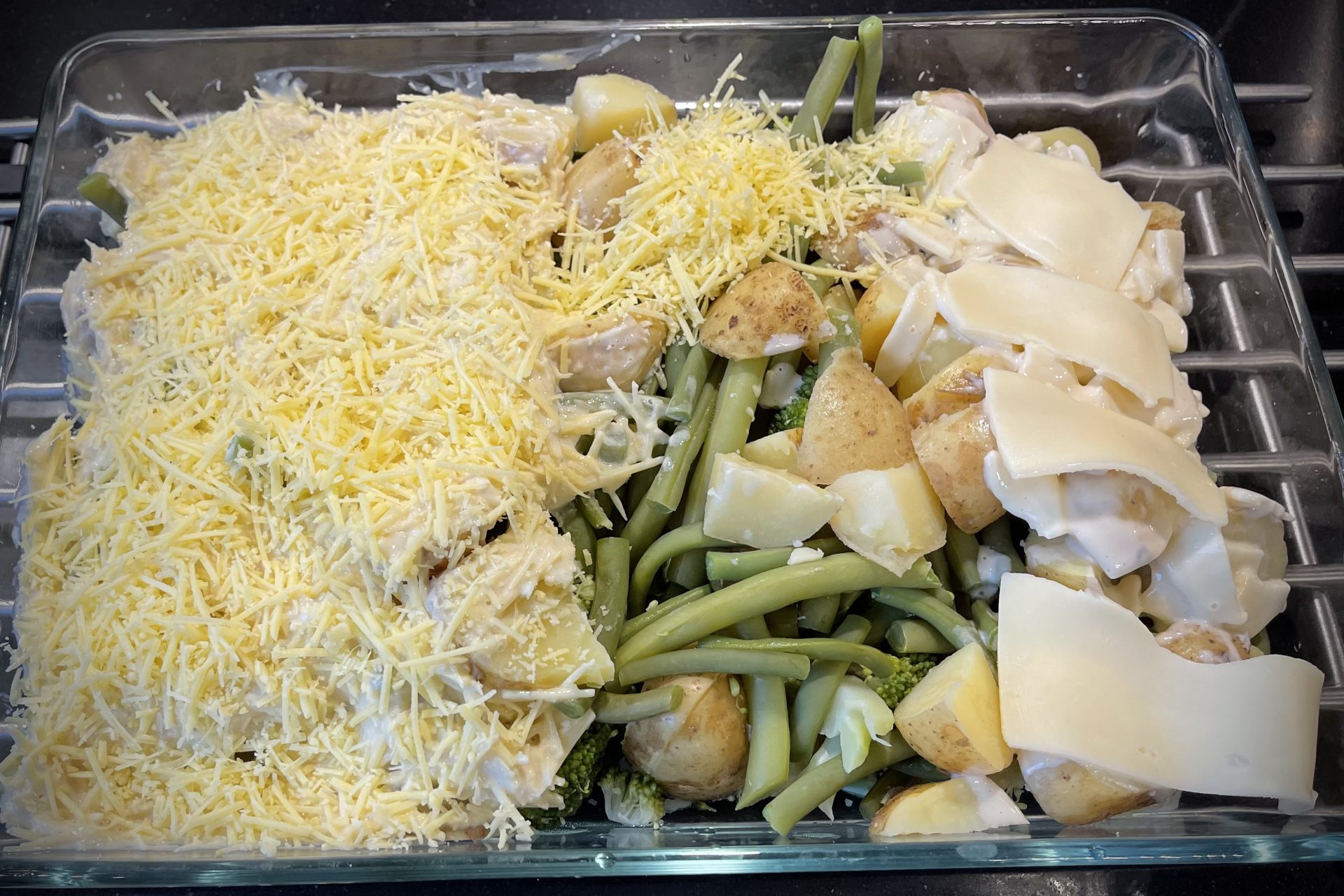 Giet de groenten af en laat even uitlekken. Meng in een kom de mosterd, geraspte kaas en slagroom. Doe de aardappelschijfjes, broccoli en sperziebonen in een ovenschaal.